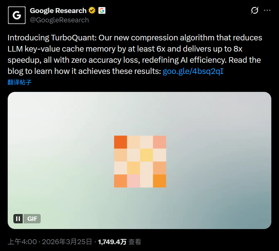 Google于2026/03/25 04:00在推上介绍了自家最新的压缩算法TurboQuant,简单来说,该算法将LLM KV缓存减少为原来1/6,计算速度提升到原来8x以上,而且没有精度丢失!